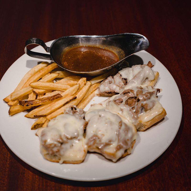 Diced Roast Beef, Peppers, Onions, & American Cheese Pan Fried & Then Topped with More American Cheese & Baked on a Hero.